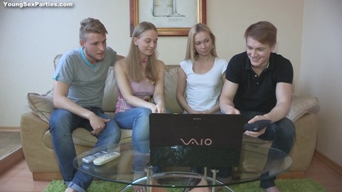 Как то раз две пары русских свингеров за общались на сайте знакомств и договорились о встрече. Молодые парни и бабы решили предаться разврату на съемной квартире. Перед тем как устроить свингерскую групповушку молодые люди выпили немного вина и посмотрели порно чтобы разогреть свое либидо. И потом они устроили дикую оргию. Пацана поменялись телками и у них начался такой жаркий секс, что девки пищали от восторга и получали много оргазмов, которые шли один за другим.