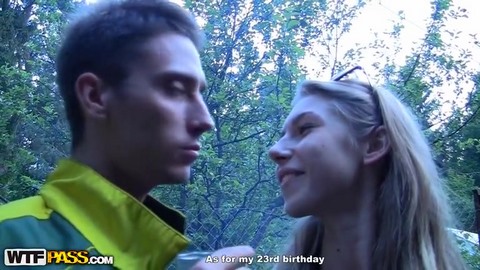 Аппетитный русский приятель разводит соблазнительную блондинку на порку прямо в лесу. Он просит красотку показать ему сладкую пизду, на что девушка спокойно реагирует и смело показывает ему все прелести между ног. Развратник не выдерживает такого соблазна и начинает лизать подруге щель языком. Потом мужик достает член и засовывает его мадам в лоно. Девушка наслаждается еблей и кончает. Спустя несколько часов прогулки лесом сладкая пара снова ебется на природе.