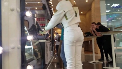 Фетишист снимает на камеру задницу девки в белых штанах