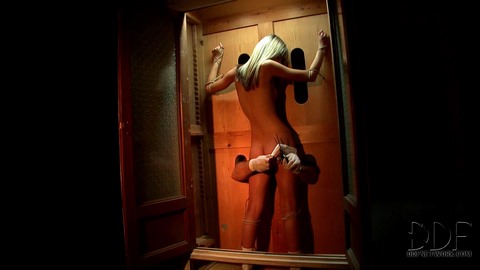 Сучка пришла получить удовольствие и не ошиблась дверью. Ее попросили раздеться до трусиков, зайти в секретный шкаф и ее руки привязали и зафиксировали. Вдруг появились чьи-то руки и начали ее сильно тискать и трогать за письку и сиськи. Она не могла пошевелиться. Но руки начали массировать ей клитор и ей это понравилось. Чем больше ее трогали, тем больше она возбуждалась. Ей не нравилось но и нравилось одновременно. Она растерянно смотрела что призойдет дальше. А руки между тем стащили с нее трусы и начали выдрачивать ей пизду по полной. Она стонала и дергалась, но волна кайфа накрыла ее и она уже не собиралась вырываться.