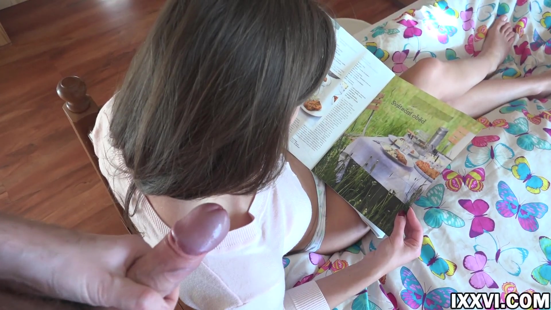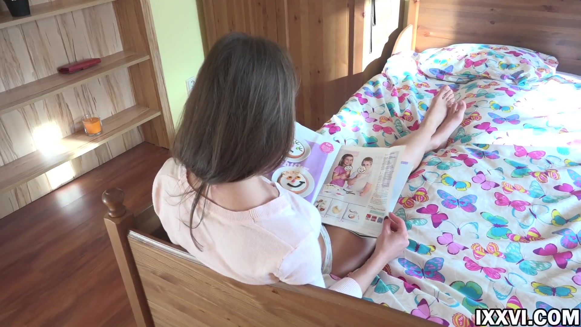 Парень зашел в спальню и обнаружил на кровати свою сидящую девушку, которая читала любимый журнал. У пацана в мыслях было только то, чтобы как следует выебать ее в пизденку, поэтому он достал свой твердый хуй и, подойдя к милашке поближе, стал водить ей по губам. Девчонка возбудилась при виде его члена и оформила ему шикарный минет, после которого встала в позу раком и позволила ему выебать себя в пизду, просто отодвинув трусики в сторону. Потом парень повалил красавицу на спину и трахал до тех пор, пока не кончил своей густой спермой ей на животик.