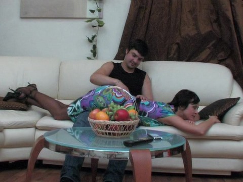 Парень сидел со своей коротковолосой подругой на диване и предложил ей сделать нежный массаж спины. Для этого ей пришлось лечь пареньку на колени, после чего они приступил к нежным прикосновениям ее спины. Наглец постепенно опускал свои шаловливые руки все ниже и, дойдя до попки, засунул руку под чулочки. Тетка пыталась сопротивляться наглому парню, но у нее ничего не вышло и она просто поддалась его напору и позволила ему жестко выебать себя в попку на этом же диване.