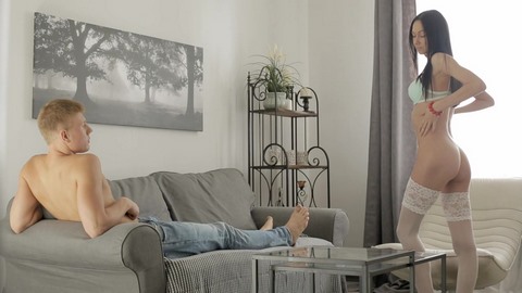 Брюнеточка с большими сисечками решила возбудить своего молодого человека и приоделась в новенькое сексуальное нижнее белье. Немного походив в нем перед парнем, она присела на диван и, стянув с себя трусики, стала пальчиками ласкать свою киску, после чего запрыгнула к заведенном пареньку и стала теребить его член через одежду. Когда малышка почувствовала, что у него жесткий стояк, она сняла с него джинсы, оформила ему шикарный минет, а потом раздвинула ножки и позволила выебать себя в пизденку.