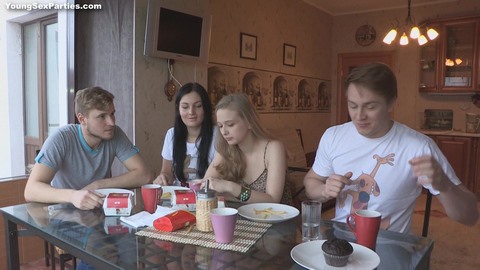Две молодые пары свингеров решили отдохнуть друг с другом на выходных и собрались у одной из пар в квартире. Накрыв стол и немного пообщавшись друг с другом, девчонки решили приступить к секс вечеринке и страстно засосали друг друга в губы, пока парни наблюдали за ними со стороны. После этого все отправились в комнату, где разделись до гола и девчонки оформили пацанам шикарный минет, а потом хорошенько поебались с ними на диване, периодически меняясь партнерами.