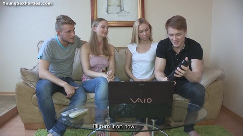 Две молодые пары сидели дома на диване и смотрели видео на ноутбуке. Кто-то из них случайно запустил порно ролик и девчонки от него дико возбудились. Захотев как-то снять сексуальное напряжение, они набросились друг на друга со страстными поцелуями, и тем самым дико завели своих парней. Те, в свою очередь, достал свои упругие хуи и получили от девчонок неплохой отсос, а потом трахали сучек в их сладкие пизденки, периодически меняясь партнерами, чтобы полностью насладиться их кисками.