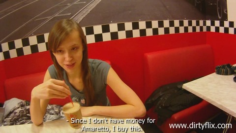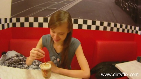 Молодой русский пикапер подцепил милую худую девчонку с длинными волосами и предложил ей сходить в местную кафешку. Девушка с удовольствием согласилась и последовала за ним. Немного побеседовав с ним за столом, она захотела в туалет. Парень решил сходить вместе с ней и стал к ней приставать. У красавицы вся киска оказалась мокрой, поэтому наглец без всякого стыда вывалил свой стояк наружу и дал малышке его отсосать, после чего оголил ее сладкую пизденку и после хорошей ебли кончил ей на личико.