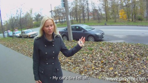Молодой пацан прогуливался по улице и к нему навстречу выбежала красивая блондиночка с просьбой о помощи. У малышка отвалилось колесо от машины и села зарядка на телефоне. Парень предложил девчонке пройтись до его квартиры, чтобы она позвонила своему молодому человеку и попросила приехать. Когда они добрались до дома паренька сучка решила сразу отблагодарить его страстной еблей. После шикарного минета она отправилась с ним в спальню, где жестко была выебана в пизду на кровати.
