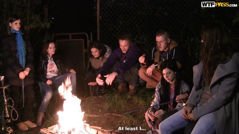 Сняв загородный домик в лесу, русские студенты приехали туда на уикенд. Им хотелось устроить для себя праздник, так что не стали ни в чем себе отказывать. Разобрав все вещички и накрыв столы, они вышли во двор и там разожгли большой костер. Болтая о том, да о сем, студенты посидели у костра и занялись групповым сексом в доме, как только туда вернулись. Парни толпой пердолили всех студенток подряд, так что некоторые из них даже испытали на себе все прелести двойного проникновения.