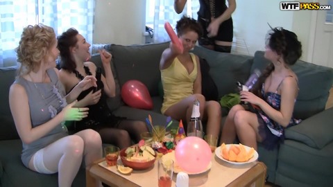 Устроив незабываемую вечеринку для девочек, русские студенты отрывались на ней как могли. Без мужской компании им стало немного скучновато, так что они вызвали жиголо, который заодно вынужден был обслуживать их, как официант. Некоторые девчонки заинтересовались красивым парнем, и решили с ним уединиться, а остальные остались в зале. Слушая сладкие стоны подружек из соседней комнаты, обалденные студентки лесбиянки занялись сексом на вечеринке, лаская и трахая друг друга секс игрушками.