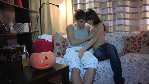 Пригласив девушку к себе домой, когда все остальные праздновали Хэллоуин на вечеринке, опытный ловелас создал романтическую атмосферу. Девка просто растаяла от того, как парень обхаживал и соблазнял ее, так что отдалась ему просто на диване. Не прошло много времени, как они уже были в горизонтальном положении и ублажали друг друга орально. Парень хотел заняться с малышкой анальным сексом, а она не смогла ему отказать. Так что русские подростки отпраздновали Хэллоуин анальным сексом дома.