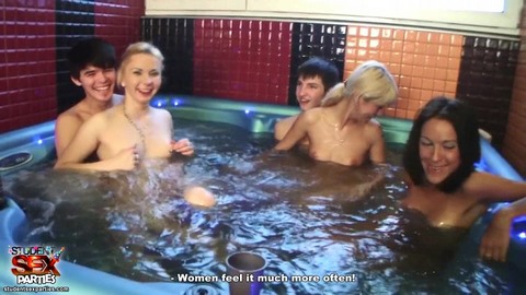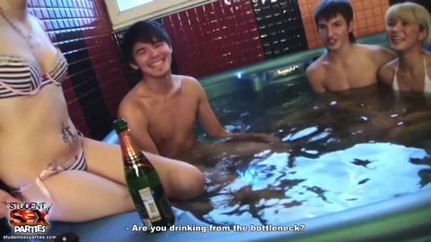 Когда студентки ехали на вечеринку, то взяли с собой купальники, прекрасно зная, что у них будет возможность поплавать в бассейне. После того, как они посидели с парнями за столом и прилично выпили, их потянуло быстрее искупаться. Переодевшись в откровенные купальники, девки пошли с парнями в маленький бассейн. Несмотря на его размеры, все они прекрасно поместились там и стали веселиться. Постепенно они разделись догола и тогда обнаженные русские студенты продолжили отрываться на секс вечеринке, уже мечтая о страстной оргии.