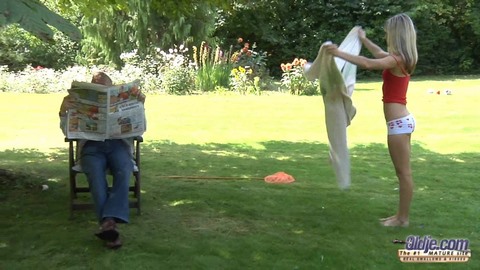 Худенькая милашка прогуливалась по парку и увидела одиноко сидящего на улице старого деда в очках. Ему стало его жалко, поэтому она подошла к нему для того, чтобы познакомиться поближе и после нескольких секунд общения она захотела ему отдаться, порадовав мужика на старость лет. Раздевшись до гола, милашка залезла сверху на старика и засосала его в губы, отчего вызвала у него дикий стояк и опустилась к нему между ног, чтобы попробовать его на вкус. После этого она положила его на траву запрыгнула к нему на хуй и дед трахал ее до тех пор, пока не получил, возможно, последний оргазм в своей жизни.