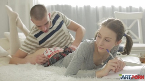 Пока миловидная русская студентка с маленькой грудью пыталась делать домашнее задание, ее бестолковый одногруппник приставал к ней. Он вовсе не думал от учебе, а только и мечтал быстрее засадить член во влажное влагалище девчонки. Она вела себя сдержанно и особо не сопротивлялась, когда он снял с нее трусики и начал ласкать. Студентка в короткой юбке согласилась на секс с одногруппником, так как его оральные ласки просто свели ее с ума. Крошка опустилась писькой на стоячий хуй парня и устроила на нем дикое родео.