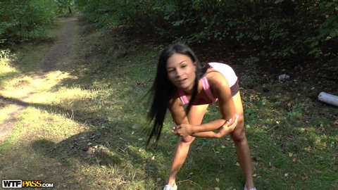 Спортивная девка вышла на пробежку по лесу и остановилась для того чтобы сделать небольшую зарядку и размяться. В этот момент мимо проходил симпатичный парень и подкатил к красотке, предлагая ей заработать приличные деньги за секс с ним. Недолго думая, малышка согласилась и поехала к пикаперу домой. Загорелая спортсменка сосала хуй за деньги и трахалась с пикапером у него дома, как последняя шлюха. Он жестко пердолил ее в разных поза и снимал все от первого лица, что вовсе не смущало продажную сучку.