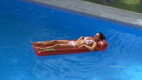 Стройная куколка приехала в отпуск к своему богатому дяде и целыми днями плавала в бассейне. Оставшись на вилле в полном одиночестве, малышка решила с пользой провести свободное время. Взяв надувной матрас, грудастая куколка оттолкнулась от берега и принялась умело мастурбировать. Трогая пальчиками чувствительный клитор, цыпочка получала огромное удовольствие. Встав на четвереньки, девка засунула в попку анальную пробку и продолжила дрочить вагину, постепенно приближая себя к финалу.