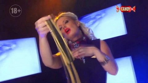 Грациозная блондинка в чулках танцует стриптиз на подиуме