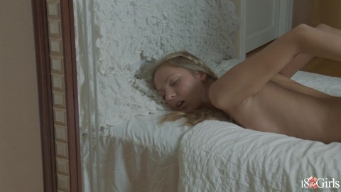 Пошлая чикса Снежана сняла в гостинице номер с большим зеркалом и перенесла его поближе к кровати, чтобы можно было разглядывать собственное тело в процессе мастурбации. Извращенка заплетает длинные светлые волосы в косички и крутится в кровати перед зеркалом, долго подбирая подходящее нижнее белье. Остановившись на белой расцветке, Снежана играет со своей маленько грудью, а затем снимает трусы и жахает себя пальцами в пизду до полного изнеможения.