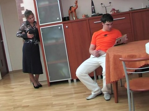 Парень в оранжевой футболке сидел на кухне и дрочил, рассматривая журнал для взрослых. За этим занятием его застукала мамаша, которая немного понаблюдала за парнем, но вскоре решила к нему присоединиться. Чувак вначале немного испугался и поспешил спрятать свой член в штаны, но не тут-то было! Дама набросилась на его прибор и принялась его страстно отсасывать. Молодой крендель быстро завелся и нагнул мамашу раком возле кухонного стола. Проникнув в ее пизду хуем, он трахал ее до самого оргазма.