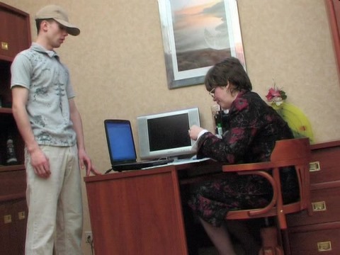 Парень пришел на ковер к завучу, которым была очкастая похотливая дама, бальзаковского возраста. Цыпа встала из-за своего компьютера и ясно дала понять, что у чувака есть только один путь не вылететь из универа. Похотливый студент совсем не возражал против такого расклада, и стал наслаждаться, когда баба принялась сосать его член. Перец так сильно завелся, что вскоре ответил ей, подарив куни. После этого женщина в чулках устроилась на столе и стонала от того, как молодой тип усердно разрабатывает ее пизду.